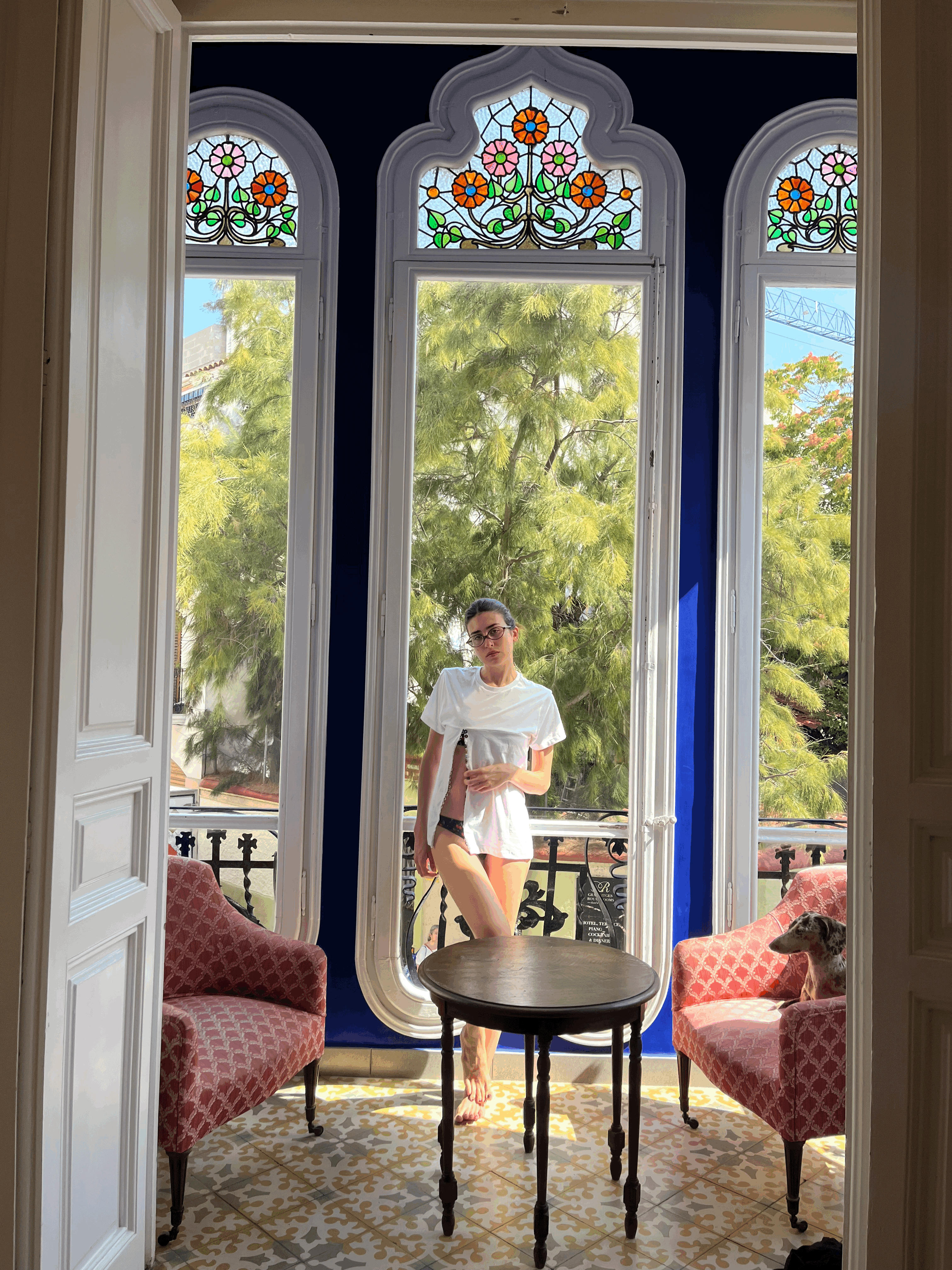 Irene wearing Atuvera’s Spanish Summer Collection, photographed inside the suite of a noucentista-
